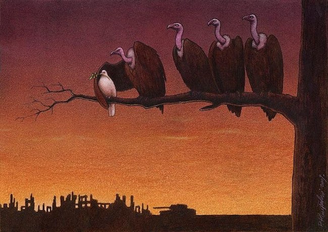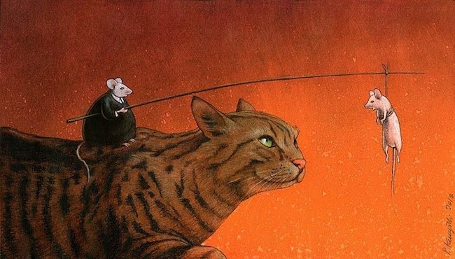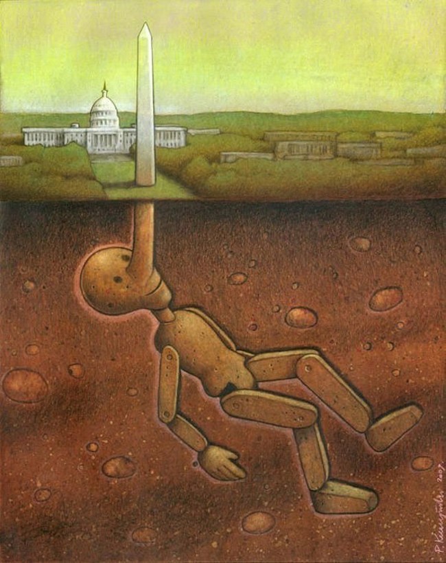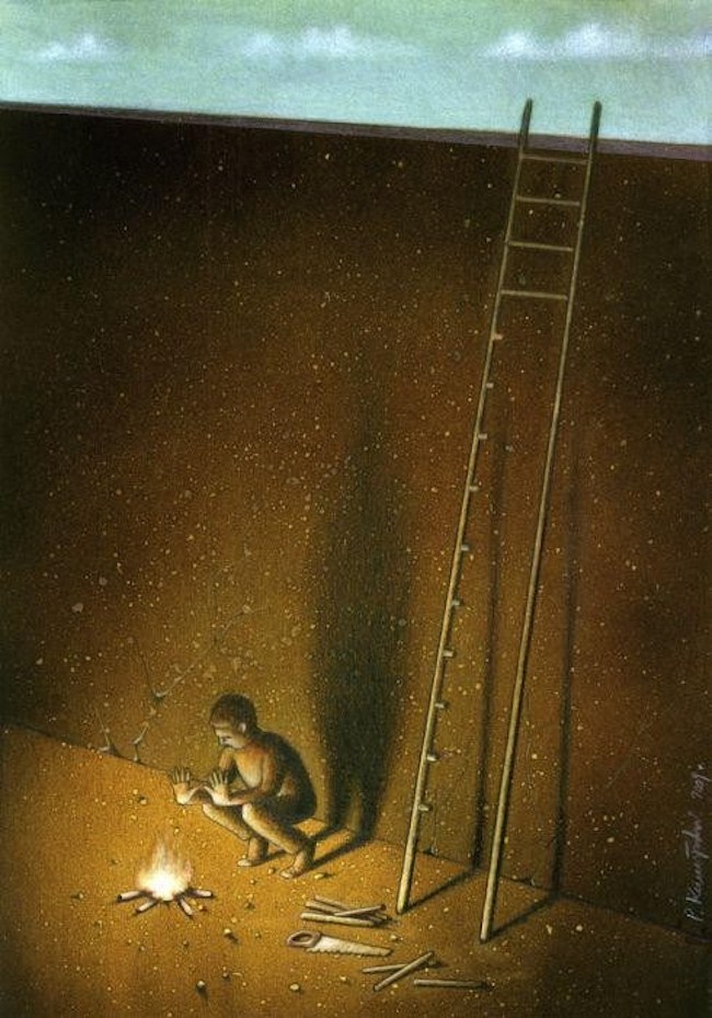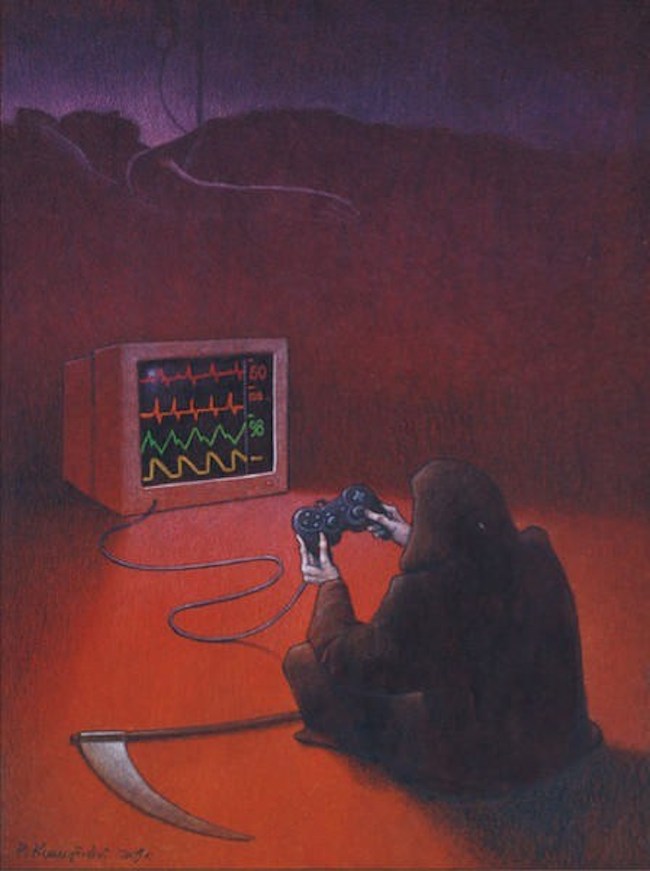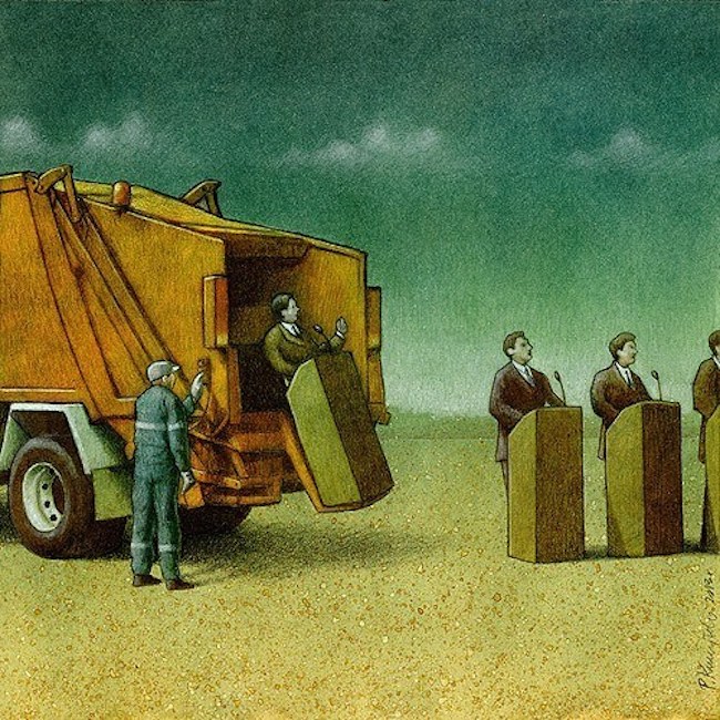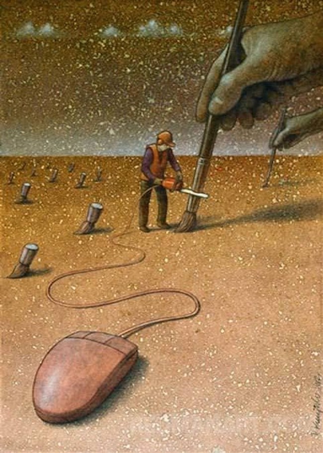 O artista Pawel Kuczynski especializado em criar ilustrações que, sem exibirem uma palavra sequer, trazem profundas reflexões sobre o quotidiano. Além de serem trabalhos excepcionais, proporcionam a retomada da criatividade aos nossos olhos e ouvidos cada vez mais passivos, pois é importante lembrar que o mundo não está só à frente, mas aos lados, acima e abaixo de nós.