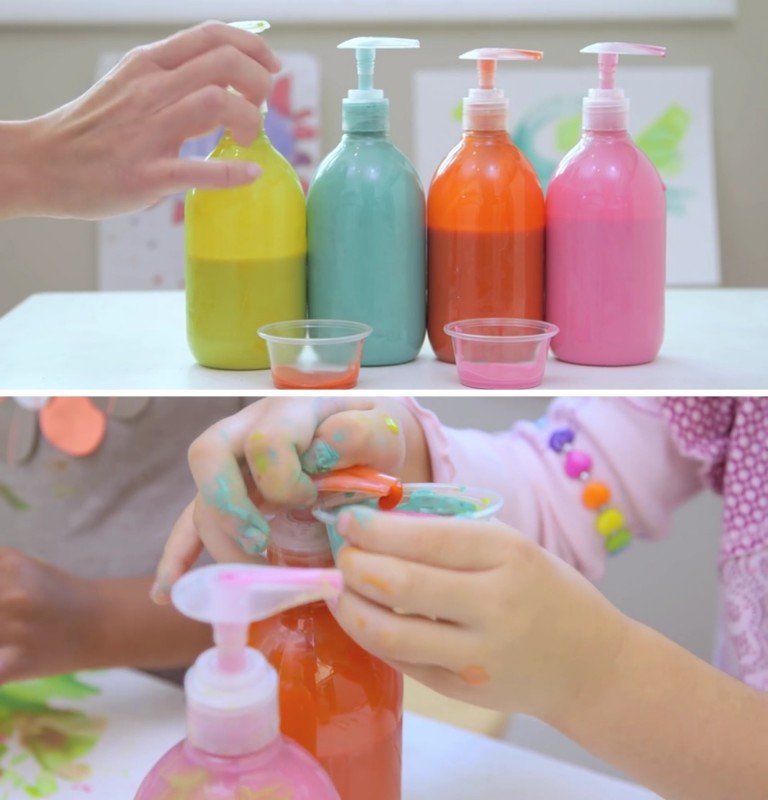 1. Coloca as tintas dentro de potes com válvula (Ex.: potes de sabonete líquido já usados). Desta forma, as crianças podem pegar na quantidade que quiserem de tinta, sem derramarem tudo pelo chão.