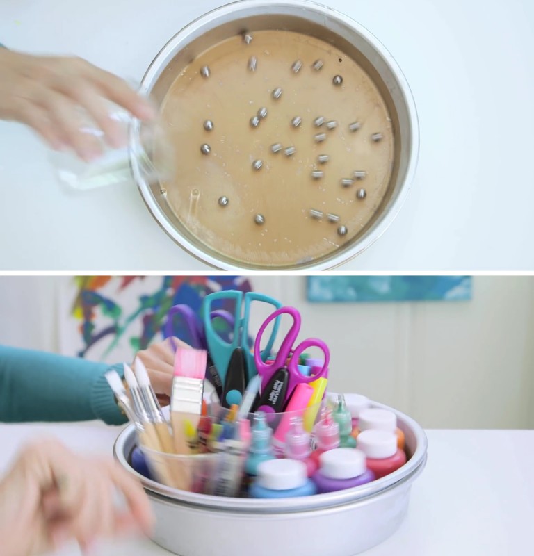 2. Podes fazer um recipiente giratório usando formas de bolo. Para isso, coloca no fundo de uma forma redonda algumas bolinhas de metal, ou algo equivalente. Em seguida, coloca uma segunda forma dentro da primeira (uma um pouco menor). Com as bolinhas ao fundo, a forma de cima vai girar facilmente. Agora é só colocar canetas, pincéis e tintas dentro e pronto! As crianças vão parar de gritar a querer alcançar o que está do outro lado da mesa.