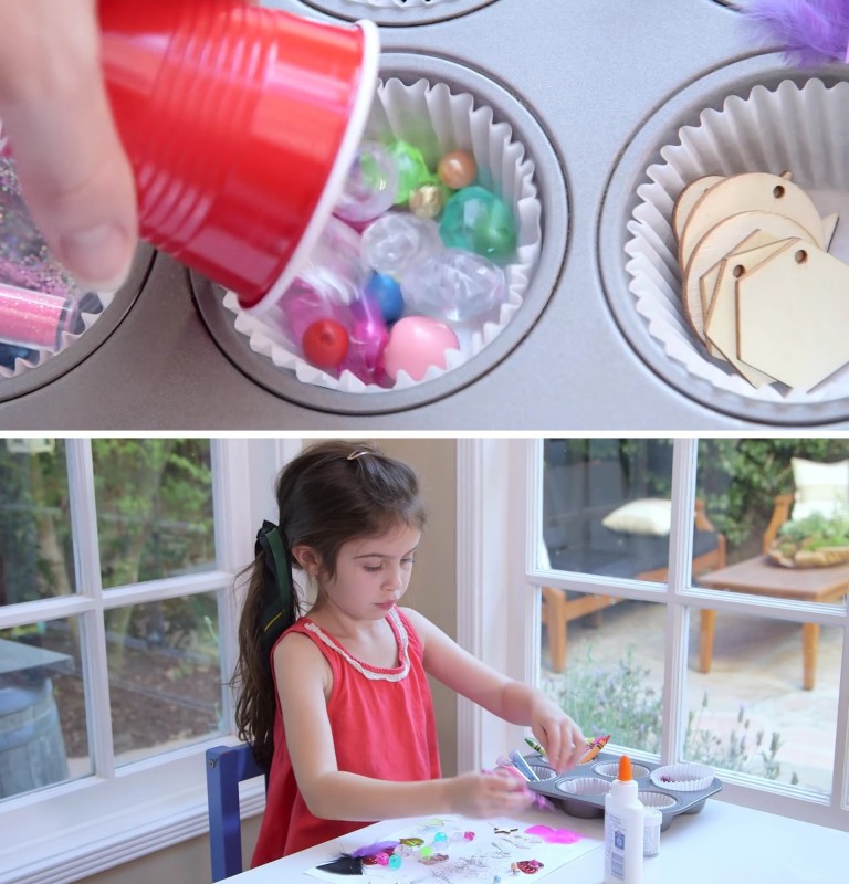 4. Se os teus filhos gostam de fazer colagens, experimenta organizar os diferentes materiais dentro de formas de empada ou muffins. Isso vai ajudar as crianças a terem tudo à mão de maneira fácil e organizada.