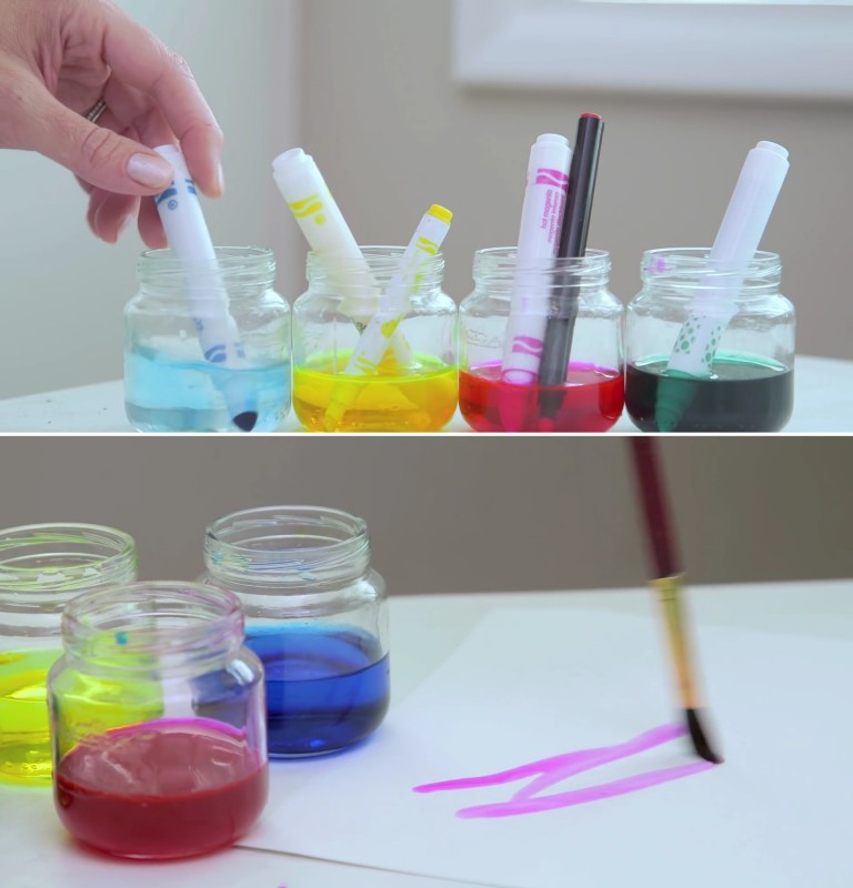5. Muitas vezes os pequenos artistas esquecem de colocar a tampa de volta nas canetinhas. Então, na próxima vez que elas acabarem secas, coloca-as em potes com água. A ponta ficará outra vez húmida e as canetinhas (e a água colorida) terão uma segunda vida como materiais para pinturas estilo aquarela!