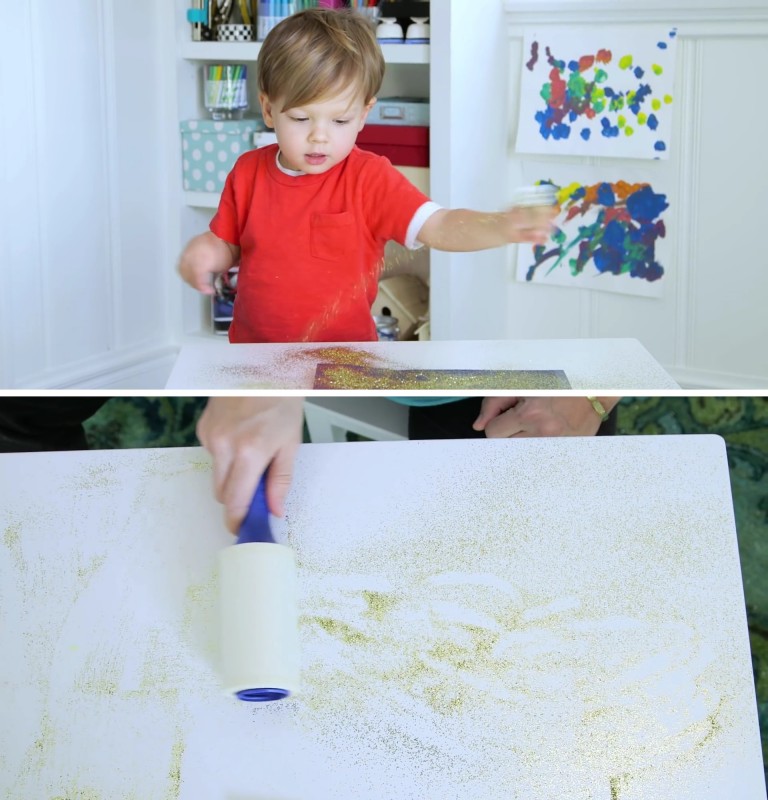 10. Não te desesperes se a pintura do teu filho acabar com uma explosão de purpurina. Basta apenas usar um daqueles rolinhos de tirar pelo de roupa para recolher os grãos coloridos!