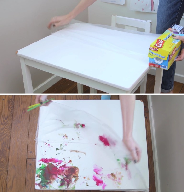 11. Para não teres que limpar a mesa depois, um ótimo truque é forrar o tampo com filme de PVC. Assim, as crianças podem fazer a lixeira que quiserem e tudo que terás que fazer será enrolar o plástico e deitá-lo fora no final.