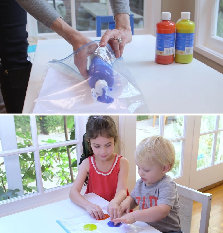13. Se a criançada estiver entediada, experimenta esta divertida (e limpa) brincadeira: coloca diversas tintas dentro de uma saca plástica estilo ziplock (destas que vão ao frigorifico) e fecha bem. Depois deixa que os pequenos apertem as tintas, misturando as cores e fazendo diferentes formas. O resultado será uma incrível obra de arte e uma casa impecavelmente limpa!