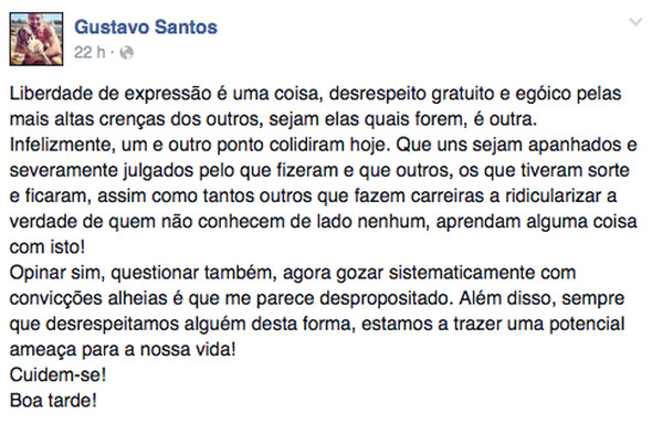 O apresentador Gustavo Santos, conhecido pelo programa “Querido mudei a casa” chocou os seus fãs com as suas palavras sobre este atentado. A bomba foi lançado através da sua conta do Facebook originando centenas de comentário.