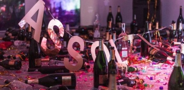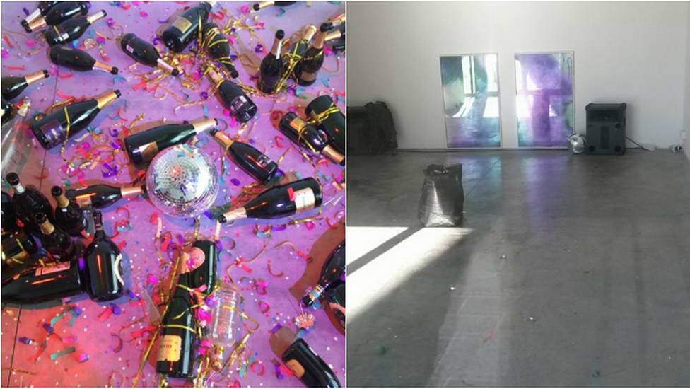A instalação, intitulada “Where shall we go dancing tonight?”, é composta por diversas garrafas de champagne vazias