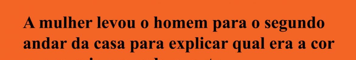 Uma senhora contratou um empreiteiro para pintar a casa. A mulher levou o homem para o segundo andar da casa para explicar qual era a cor que queria em cada quarto. Quando entraram no primeiro quarto a mulher disse: – Acho que vou querer este quarto pintado de bege. O empreiteiro anotou num bloco, foi … Continue a ler Uma mulher contrata um empreiteiro para lhe pintar a casa…